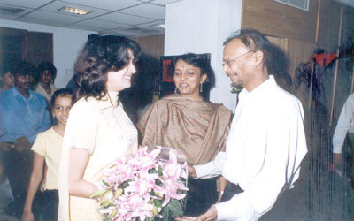 Bengali actress Debashree Roy receiving a bouquet from Make A Wish Foundation Director Puneet Bagrodia and The Address Designer Mukul Agarwal (center) with her daughter Riya (left) at the inaugural function of Kilims & Dhurries